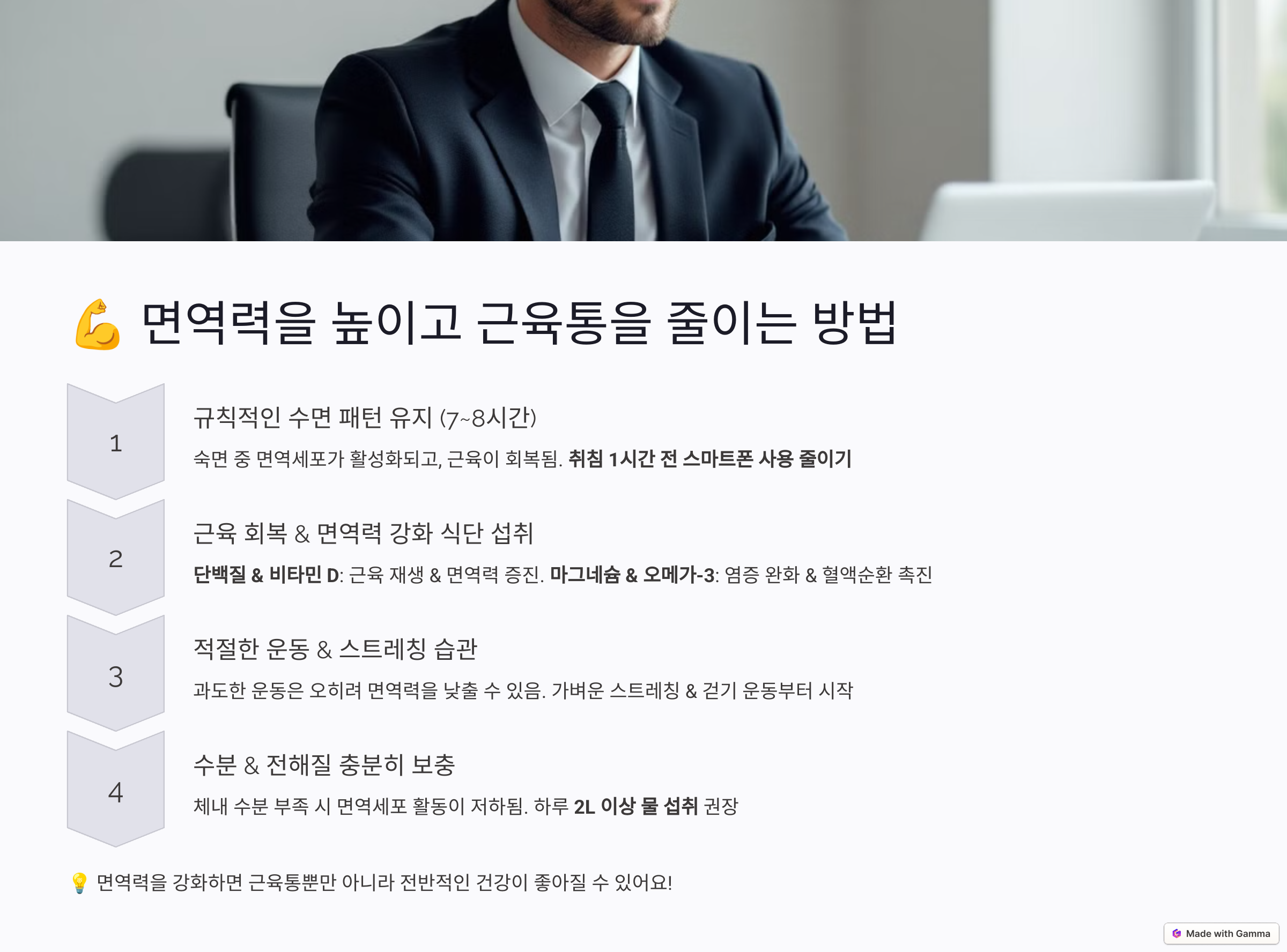 💡 면역력을 강화하면 근육통뿐만 아니라 전반적인 건강이 좋아질 수 있어요!