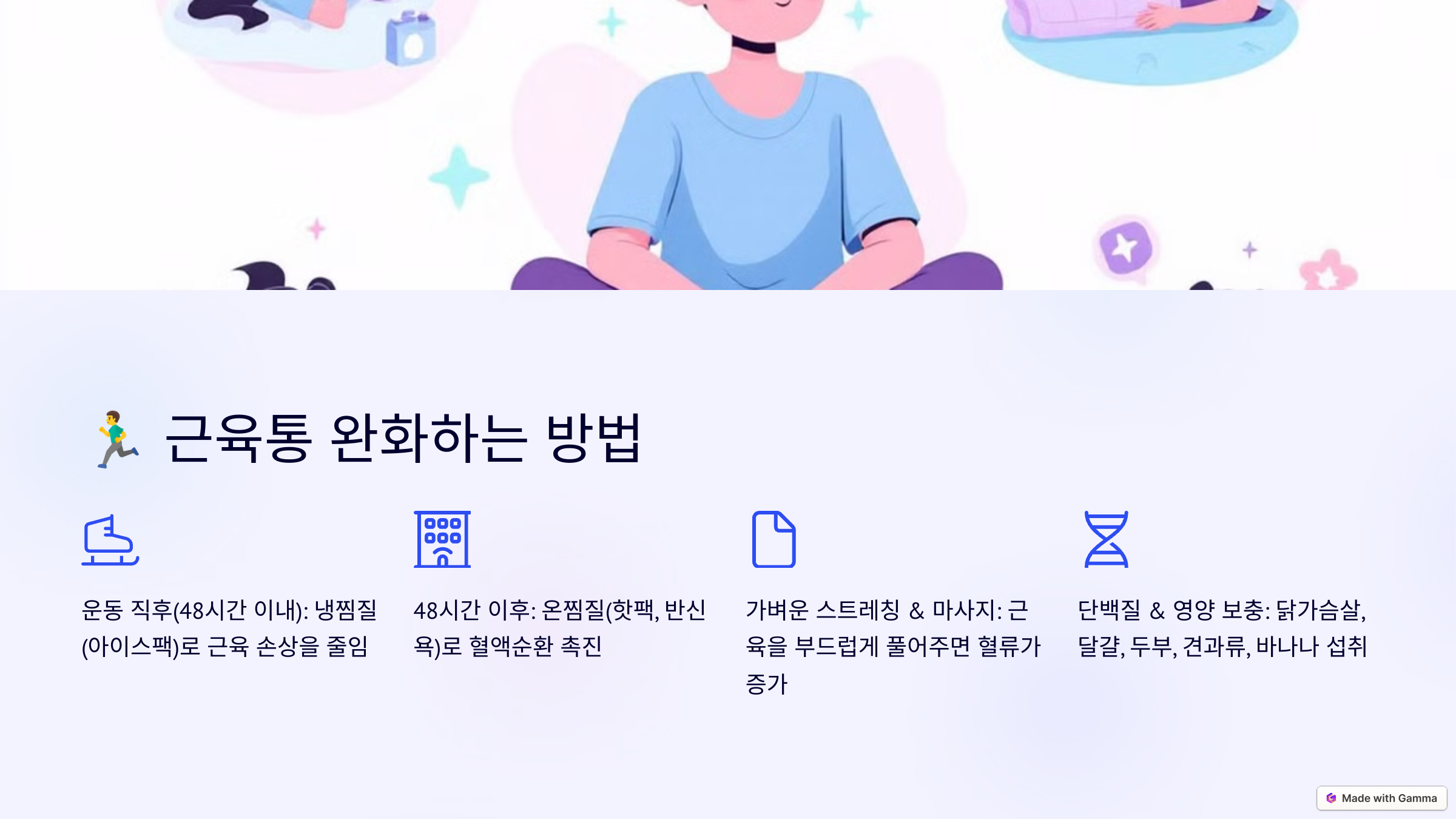 - 운동 직후(48시간 이내): 냉찜질(아이스팩)로 근육 손상을 줄임