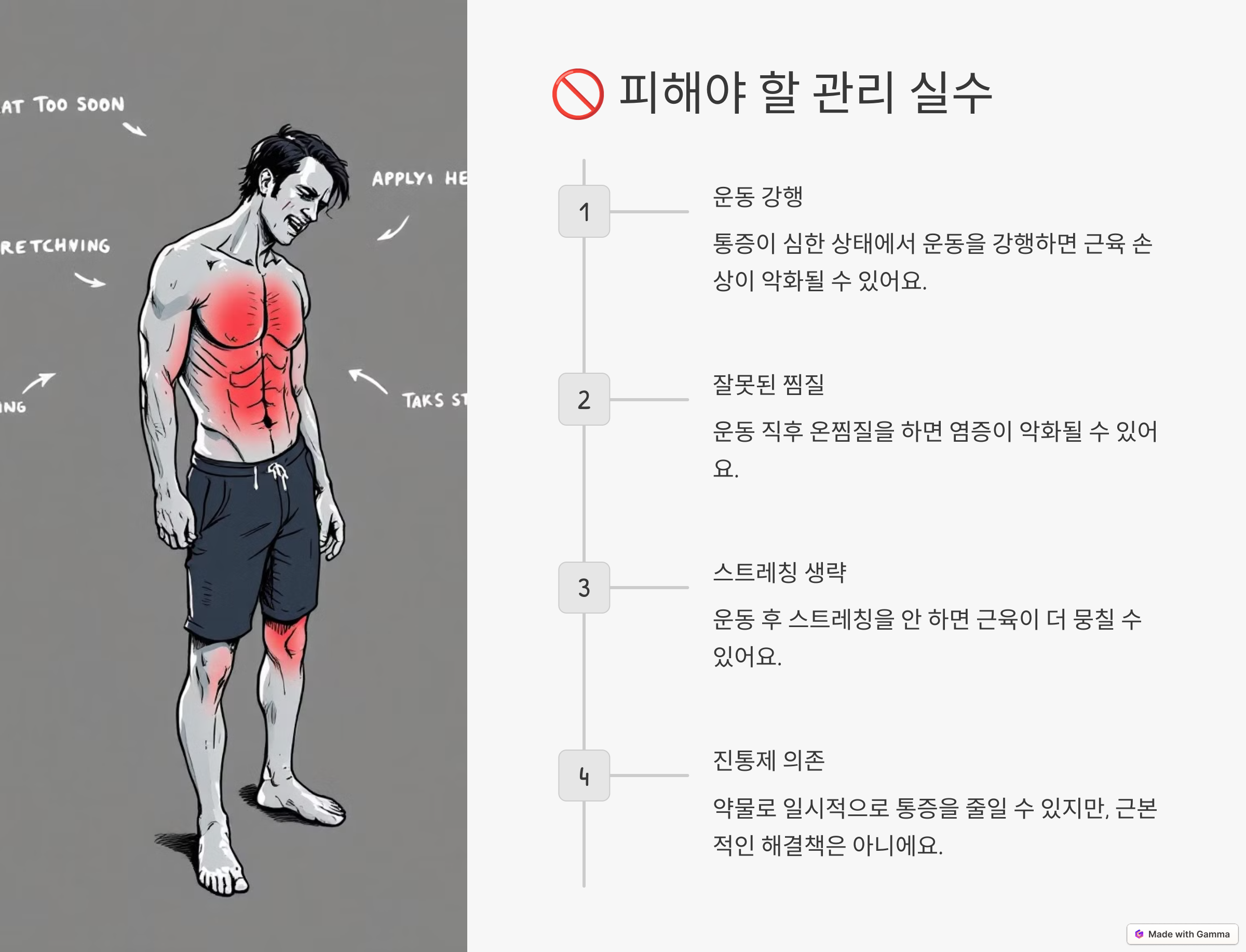 근육통을 제대로 관리하지 않으면 오히려 통증이 더 오래 갈 수 있어요! 다음 실수들은 피하는 게 좋아요.