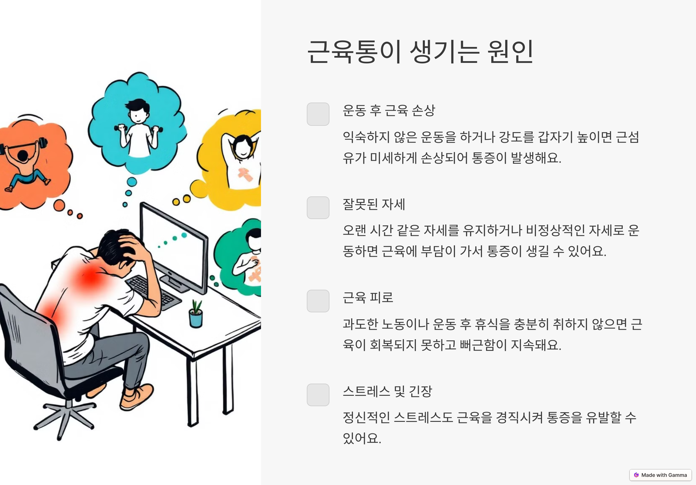 🔹 잘못된 자세 – 오랜 시간 같은 자세를 유지하거나 비정상적인 자세로 운동하면 근육에 부담이 가서 통증이 생길 수 있어요.