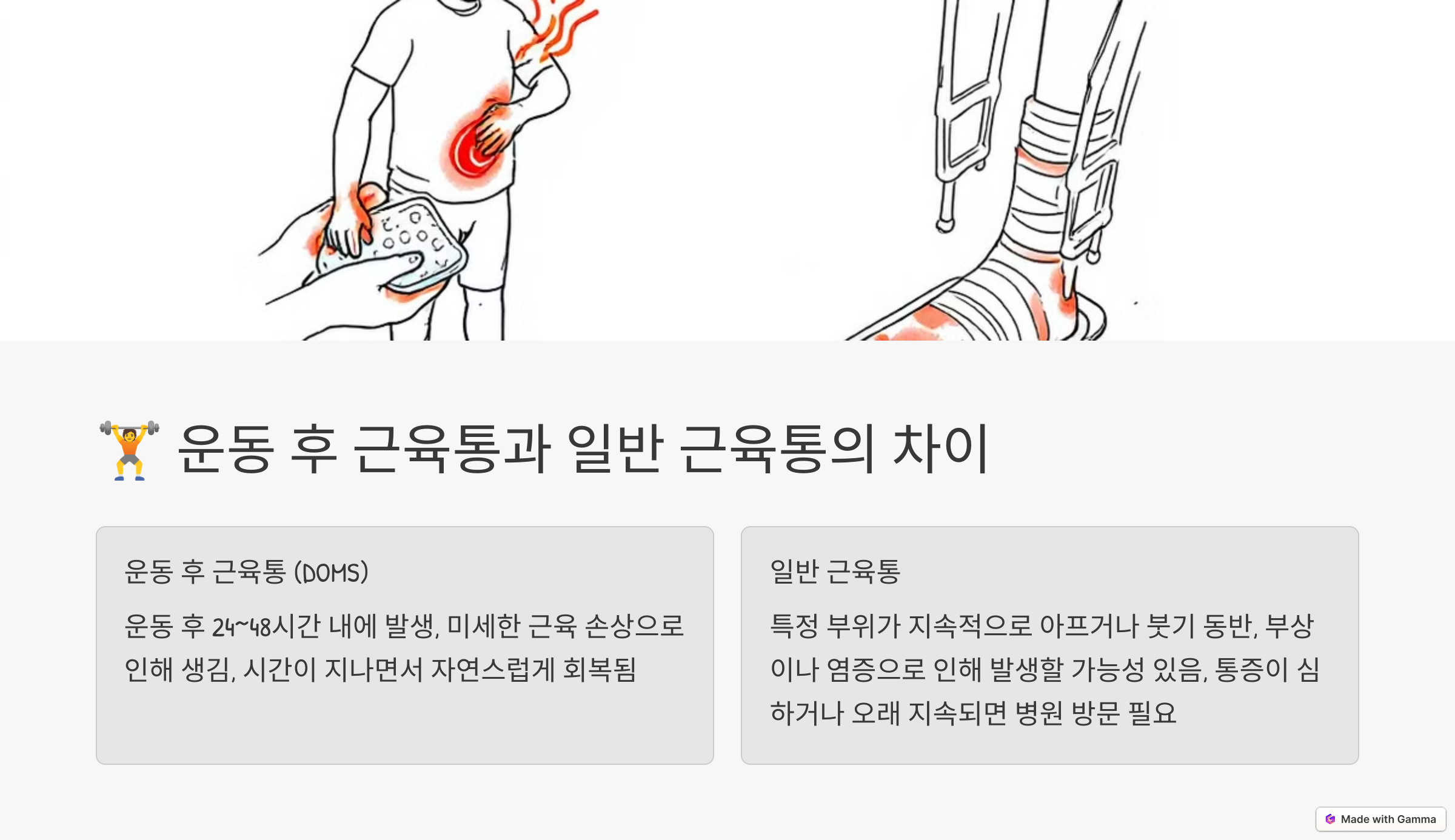 🔹 부상 및 염증 – 타박상이나 근육 염좌(삠) 같은 부상이 근육통을 유발할 수 있어요.🏋️ 운동 후 근육통과 일반 근육통의 차이