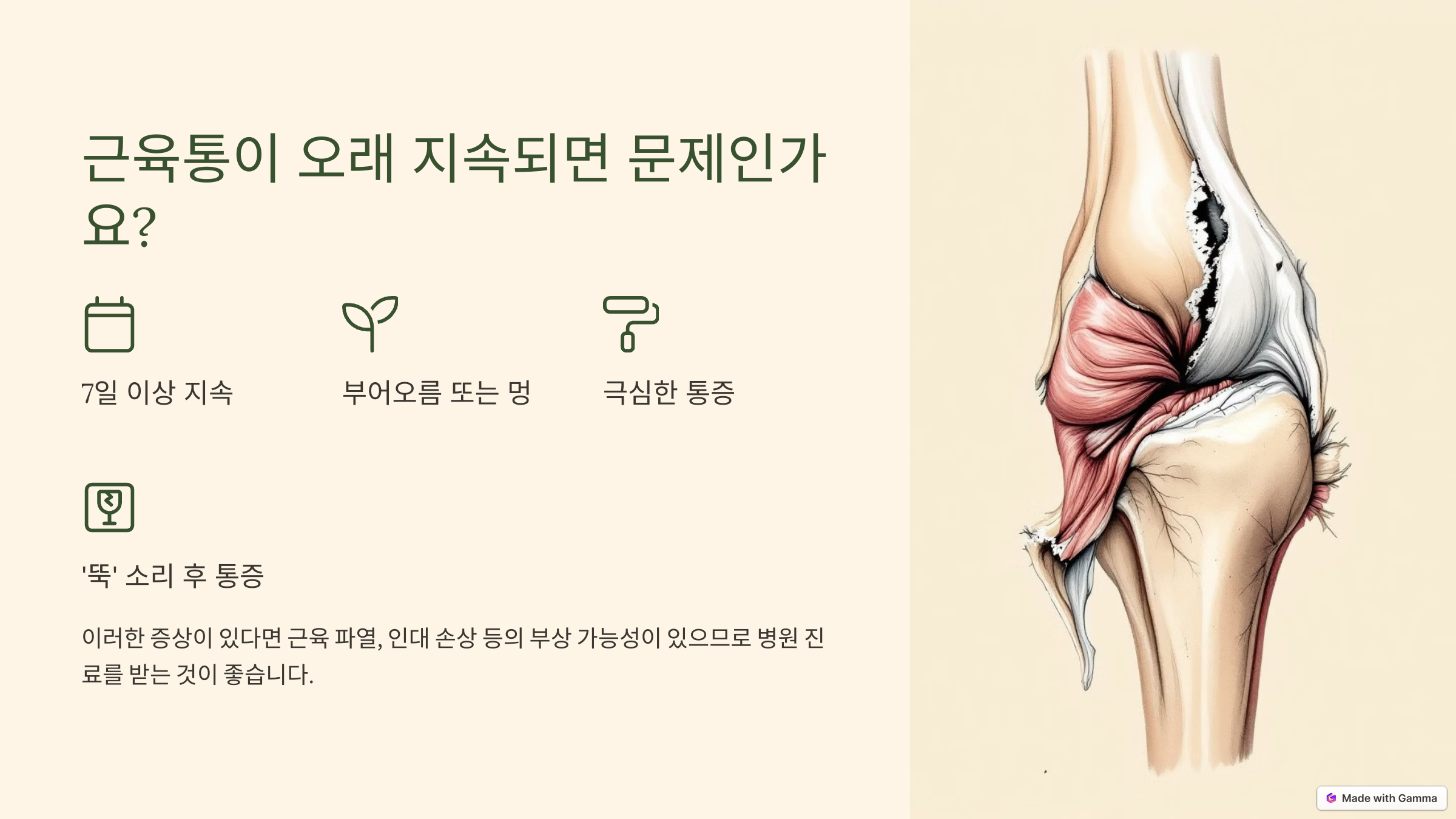 일반적인 근육통은 3~5일 내에 자연 회복됩니다. 하지만 다음과 같은 경우라면 주의해야 합니다.
