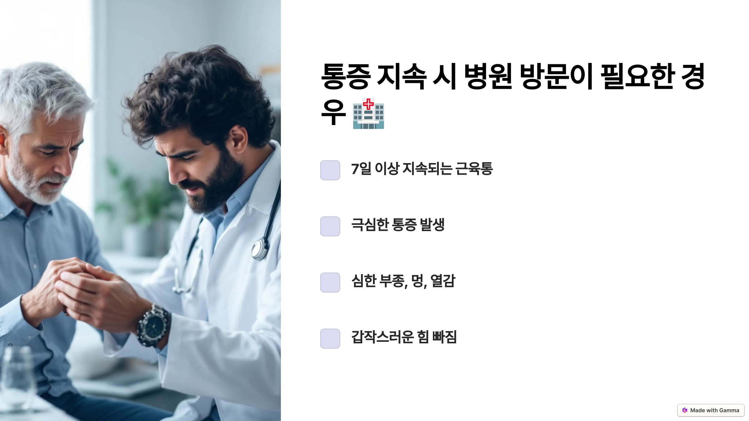 대부분의 경우 3~5일 내에 자연스럽게 사라지지만, 통증이 7일 이상 지속되거나 점점 심해진다면 단순한 근육통이 아닐 수 있습니다.