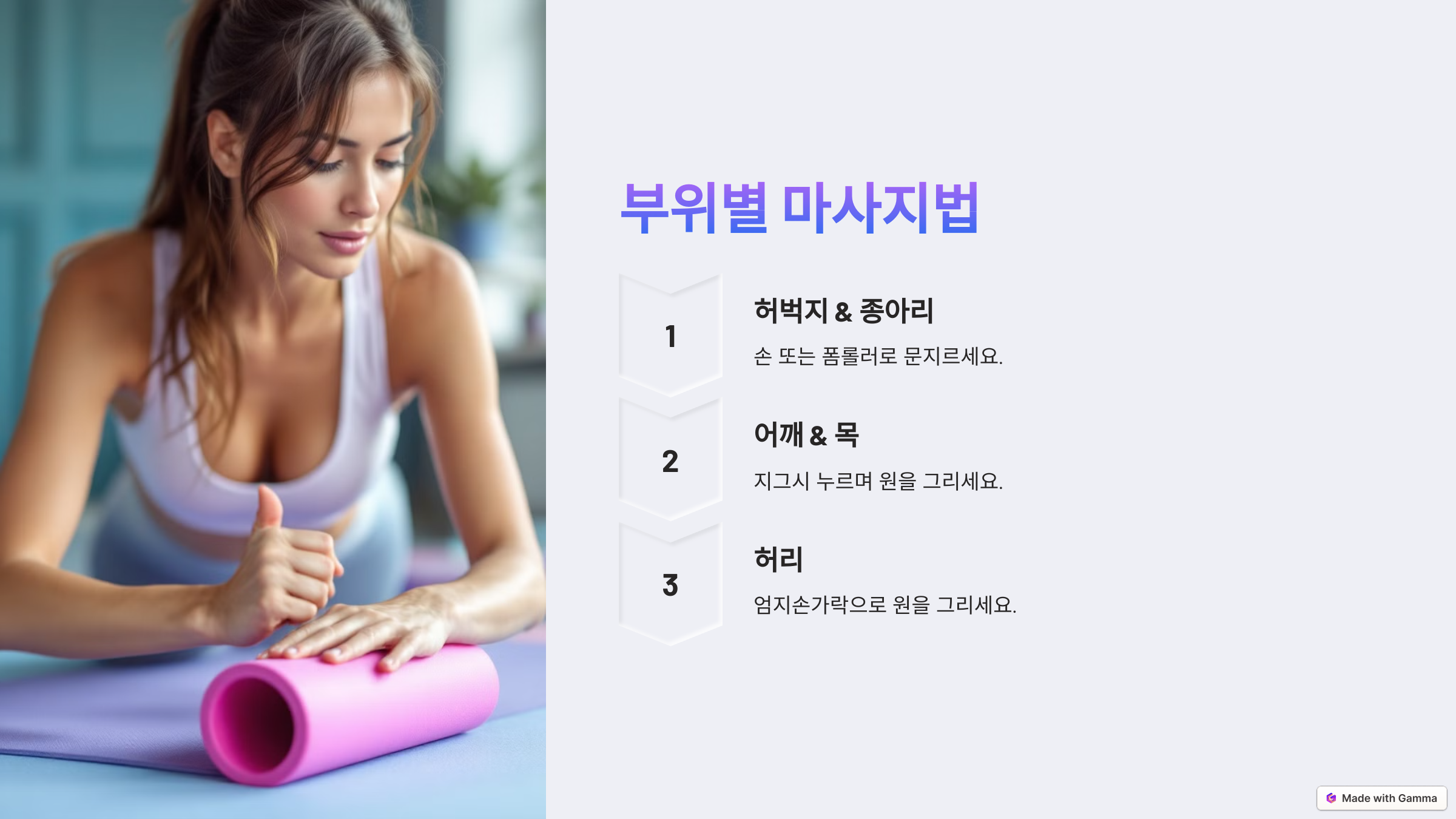 💡 TIP: 폼롤러를 활용하면 더 깊은 마사지가 가능해요!