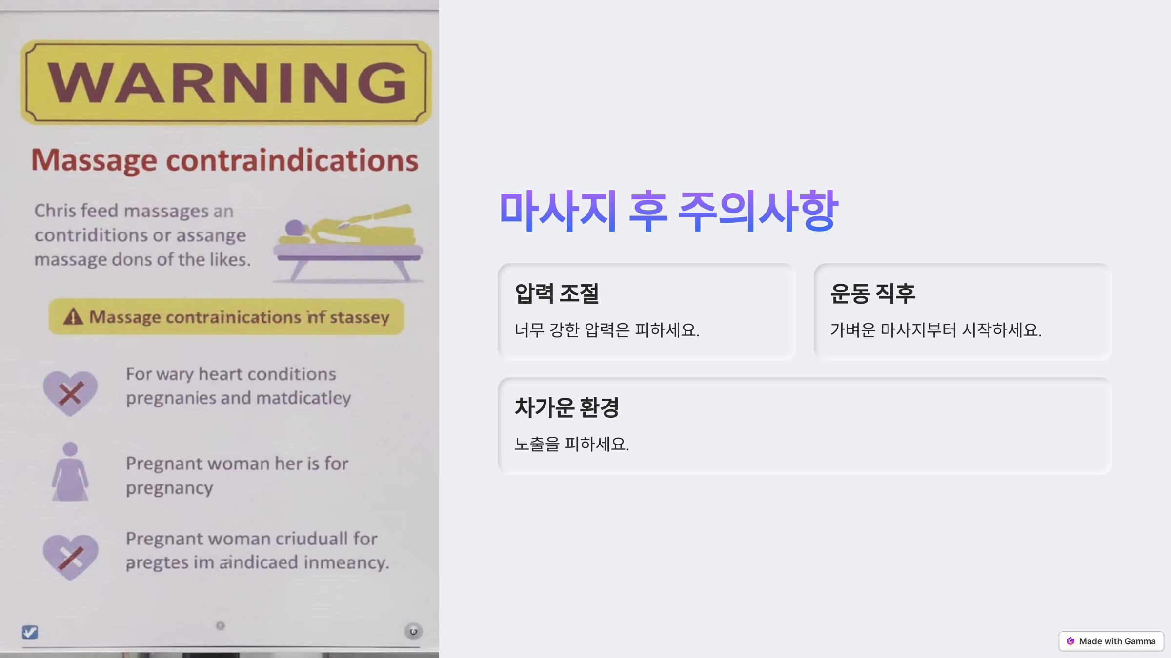 📌 마사지 후 바로 차가운 환경에 노출되지 말 것 – 혈액순환 저하 가능성 있음