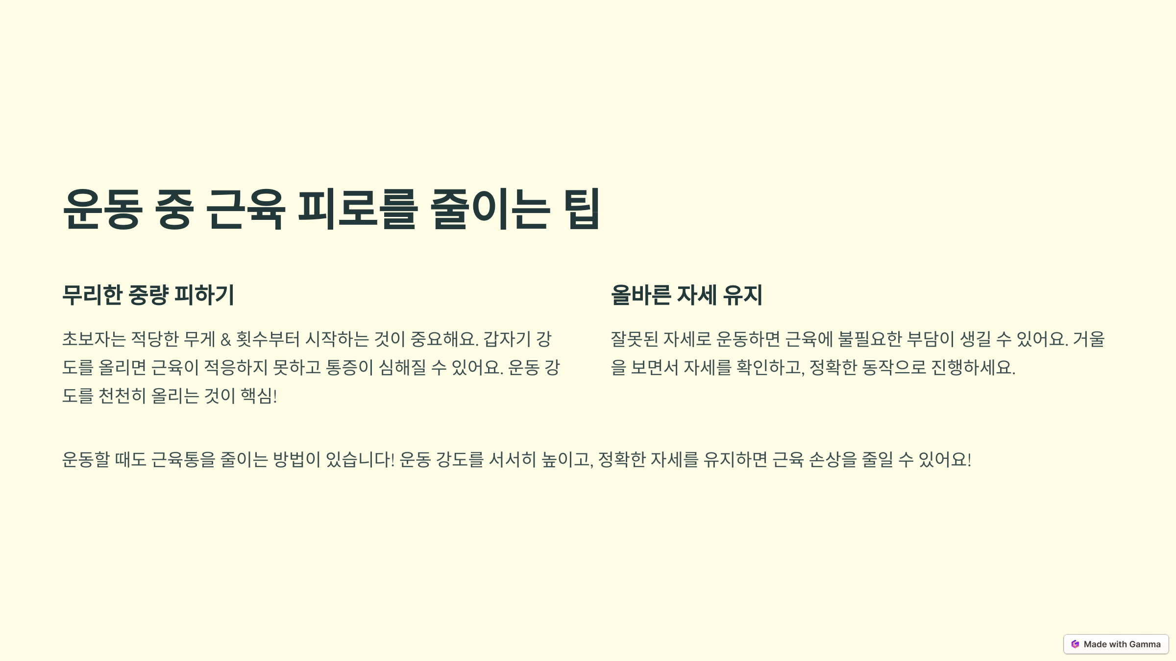 💡 운동 강도를 서서히 높이고, 정확한 자세를 유지하면 근육 손상을 줄일 수 있어요!