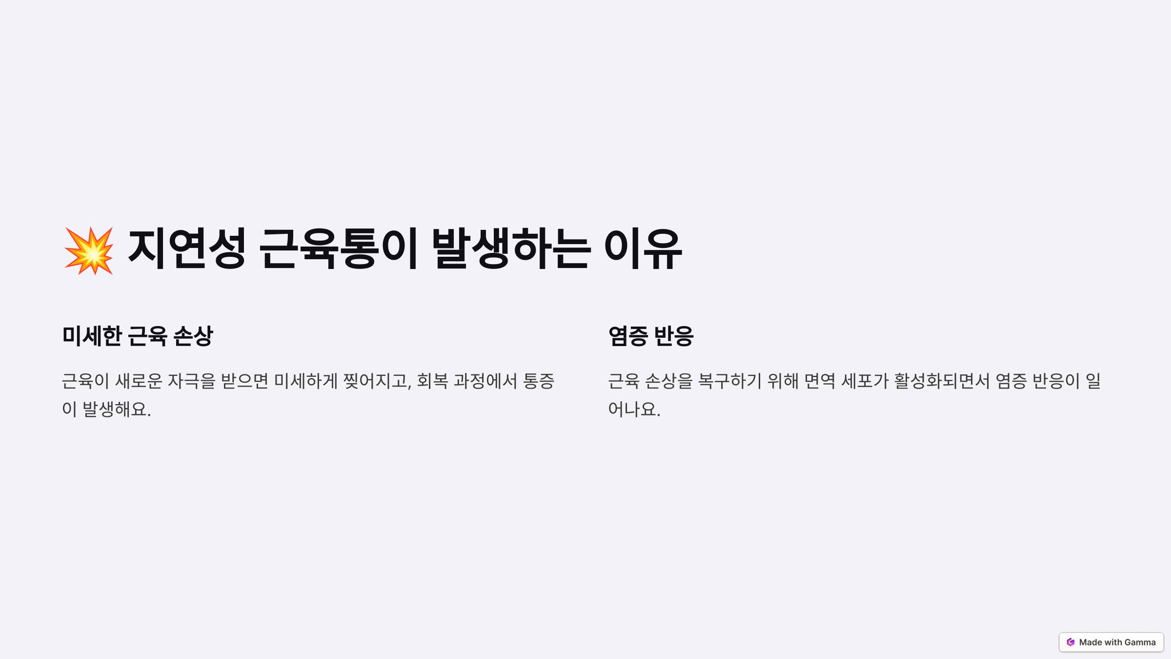 • 근육이 새로운 자극을 받으면 미세하게 찢어지고, 회복 과정에서 통증이 발생해요.