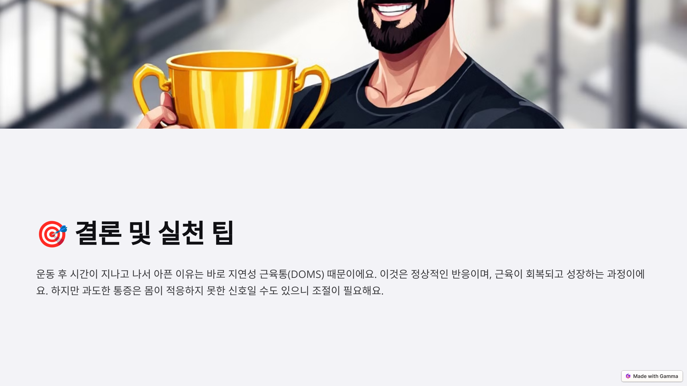 DOMS는 근육이 손상되었다는 신호가 아니라, 근육이 성장하고 적응하는 과정이랍니다. 즉, 어느 정도의 지연성 근육통은 정상적인 반응이에요!