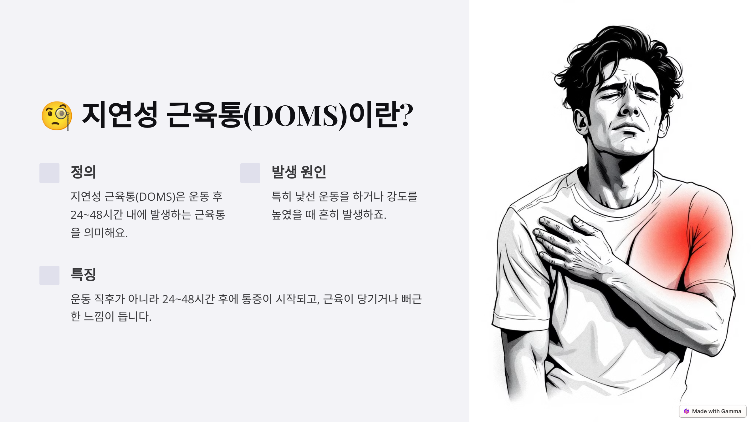 지연성 근육통(DOMS)은 운동 후 24~48시간 내에 발생하는 근육통을 의미해요. 특히 낯선 운동을 하거나 강도를 높였을 때 흔히 발생하죠.