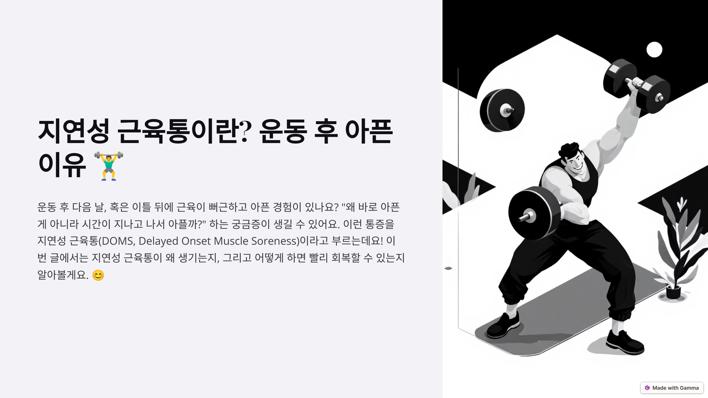 운동을 한 다음 날, 혹은 이틀 뒤에 근육이 뻐근하고 아픈 경험이 있나요? "왜 바로 아픈 게 아니라 시간이 지나고 나서 아플까?" 하는 궁금증이 생길 수 있어요. 이런 통증을 지연성 근육통(DOMS, Delayed Onset Muscle Soreness)이라고 부르는데요! 이번 글에서는 지연성 근육통이 왜 생기는지, 그리고 어떻게 하면 빨리 회복할 수 있는지 알아볼게요. 😊