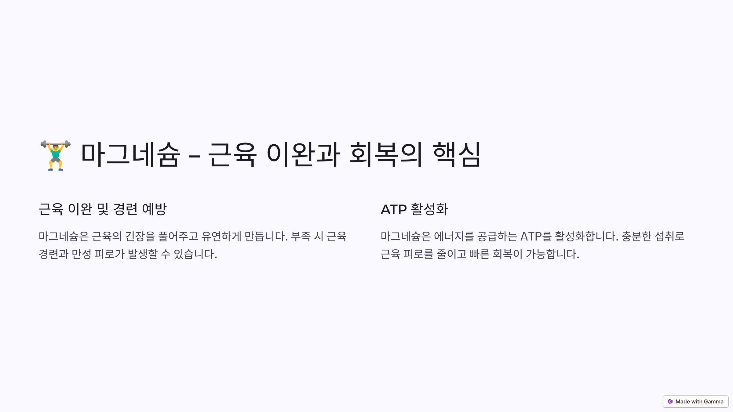 마그네슘이 부족하면 ATP 생성이 원활하지 않아 운동 후 피로가 더 심해질 수 있습니다. 즉, 마그네슘을 충분히 섭취하면 근육 피로가 덜하고 더 빠르게 회복할 수 있어요.