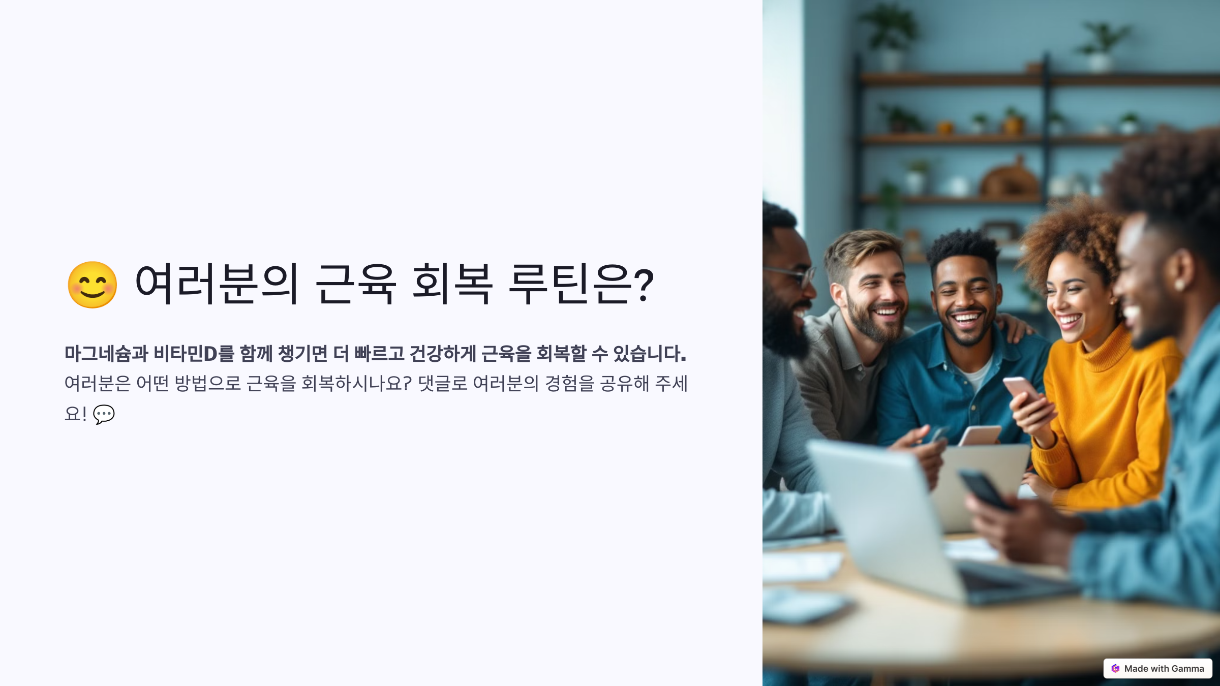 운동 후 충분한 단백질 섭취도 중요하지만, 마그네슘과 비타민D를 함께 챙기면 더 빠르고 건강하게 근육을 회복할 수 있습니다. 여러분은 어떤 방법으로 근육을 회복하시나요? 댓글로 여러분의 경험을 공유해 주세요! 💬
