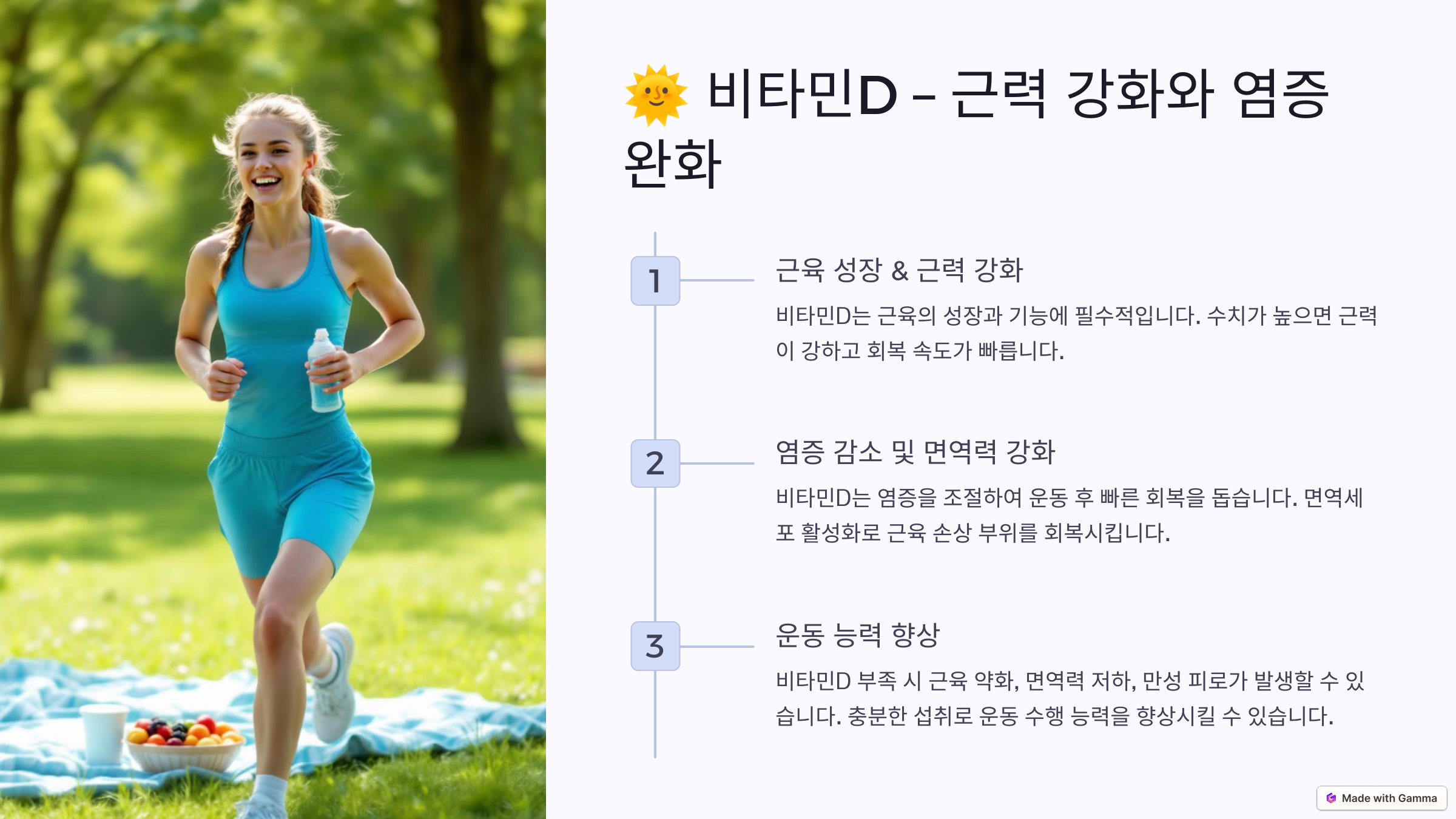📌 연구에 따르면, 비타민D 수치가 높은 사람은 근력이 강하고 회복 속도가 빠른 경향이 있습니다.